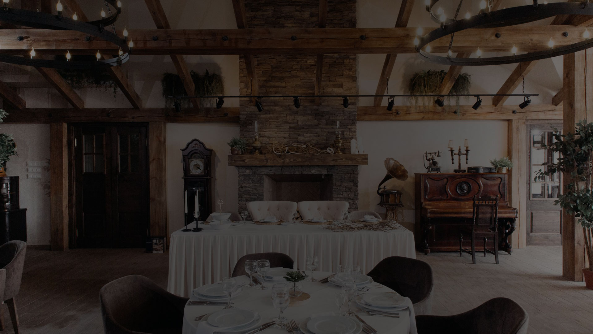 В оформлении зала лаконично сочетаются эко-решения вместе с элементами архитектуры эпохи возрождения. Изысканный интерьер в старинном стиле каждой деталью напоминает нам об истории и традициях.Возможность свободного размещения мебели позволит экспериментировать с рассадкой гостей от 20 до 150 человек. Белоснежные скатерти подчеркивают умеренную роскошь и торжественную атмосферу. Интерьер банкетного зала обильно заполнен зеленью. Большой камин в центре из натурального камня создает домашний уют. Расположенная рядом лаунж-зона приглашает для душевных бесед на уютных диванчиках с гостеприимным кэндибаром. Изысканная кухня предоставит Вам широкий ассортимент банкетных блюд.